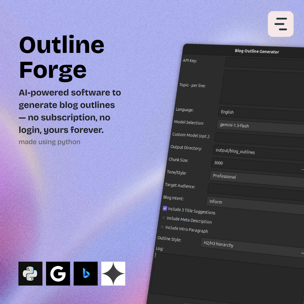 Say hello to OutlineForge Pro β a lightning-fast desktop tool that turns your blog topic ideas into structured, search-optimized outlines using Google Gemini AI.